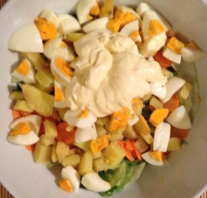 Vacsorára saláta készült: volt a hűtőben egy darab jégsalátám, és egy marék rukkola is, élelmiszert még a teszt kedvéért sem szeretnék kidobni, így felhasználtam, ahogy jeleztem is, hogy az első hónapban ezt fogom tenni. A salátába bele került még egy szem tegnapi ebédről megmaradt krumpli, egy darab sárgarépa (szép színt ad a salátának) és 3 db főtt tojás. Majonézzel kevertem össze. Ez a saláta, akkor a legfinomabb, ha a krumpli és a tojás még melegen kerül bele. A majonézem pont kifogyott, már nem tudtam többet kinyomni belőle, hiába állítottam fejre vagy ráztam veszettül. Ilyenkor én fogom és szétvágom a flakont, majd kikanalazom a benne maradt majonézt. Nézzétek a képet, mennyi maradt volna bent, de ez így pont elég egy salátára.
