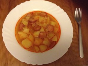 Nagyon ritkán van nálunk paprikás krumpli kb. évente egyszer. A legnagyobb meglepetésemre viszont a lányok nagyon megörültek és hatalmas adagot, nagyon jóízűen meg is ettek, öröm volt nézni. Mindhárman úgy szeretjük enni, hogy a tálalás után villával szétnyomkodva. Mivel a virslit belefőztem, így elfogyott a krumplim és virslim is.